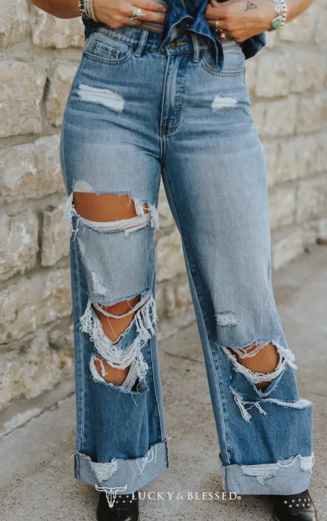 Western-inspired high-rise jeans with authentic cowgirl attitude and everyday comfort. These jeans feature a classic medium wash denim with heavy distressing throughout the legs, delivering a bold, broken-in look. The straight-to-wide leg silhouette with cuffed hems creates an effortlessly cool, vintage western style while offering a flattering fit. These jeans are perfect for pairing with boots, booties, or casual footwear.